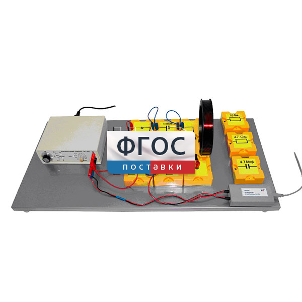 Последовательный колебательный контур собран на металлической платформе с магнитным закреплением элементов и использованием жестких соединителей для объединения элементов в электрическую цепь. Обозначения элементов нанесены на их лицевой (верхней) поверхности.