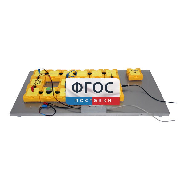 Установка, включающая цепь разряда конденсатора через резистор и цепь его зарядки, собрана на металлической платформе с магнитным закреплением элементов и использованием жестких соединителей для объединения элементов в электрическую цепь. Обозначения элементов нанесены на их лицевой (верхней) поверхности. Кнопочный выключатель обеспечивает отключение конденсатора от источника питания на время разряда через резистор.
