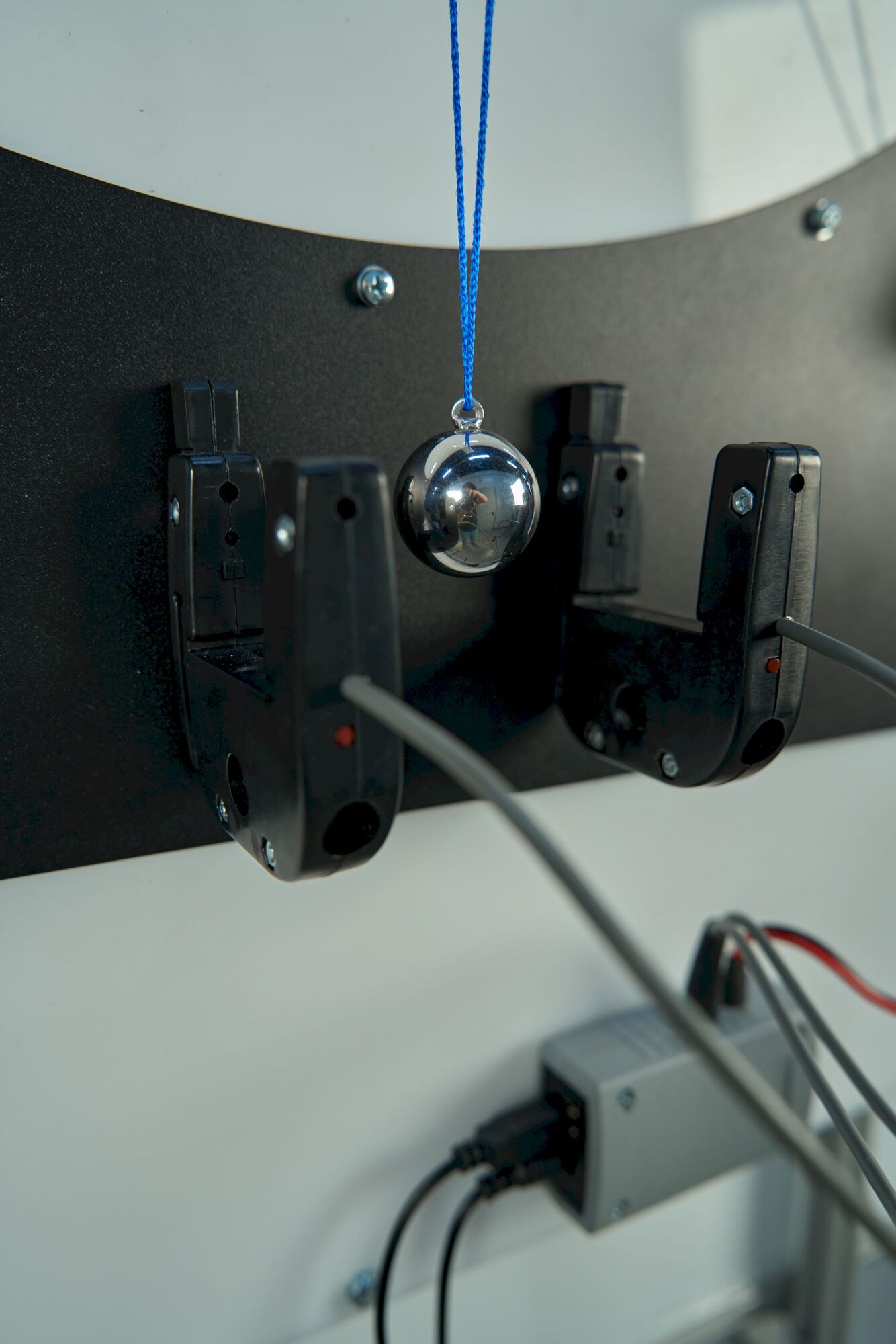 Лабораторная установка обеспечивает центральный удар двух стальных шаров одинаковой или различной массы, один из которых перед столкновением покоится. Шары подвешиваются на регулируемых по высоте бифилярных подвесах, которые крепятся к кронштейну в верхней части стенда. Для обеспечения стабильных начальных условий имеется пусковое устройство, управляемое с компьютера.
