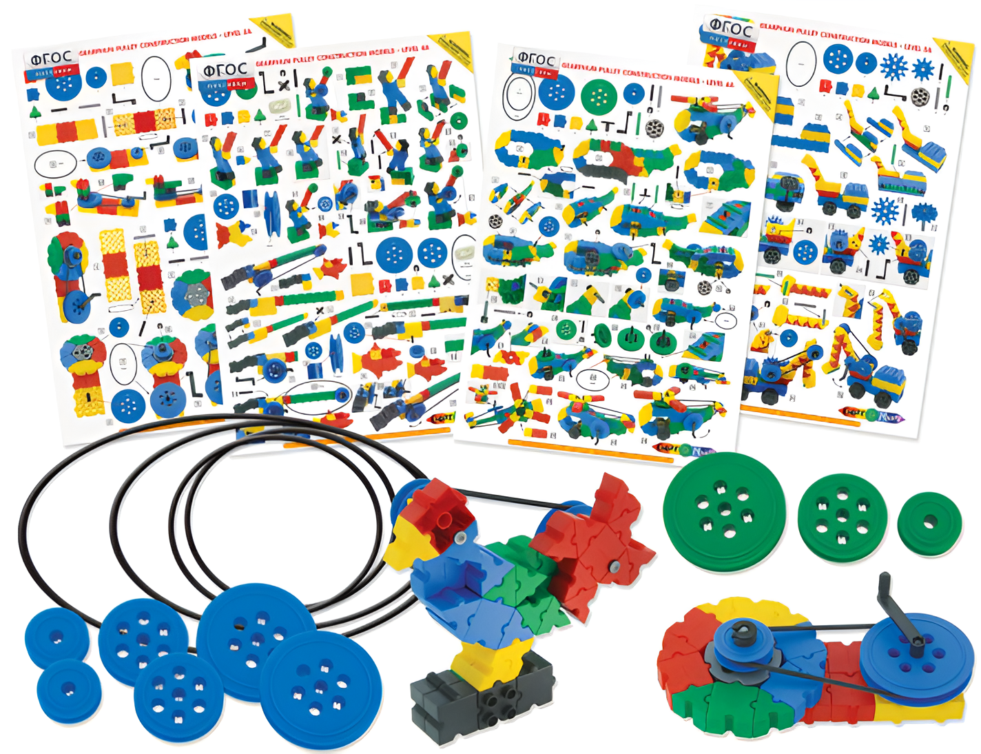 Конструктор содержит 13 деталей с удобными и надежными креплениями для соединения элементов между собой. Набор позволяет связывать между собой шкивы при помощи силиконовых колец или какой-либо верёвки/нити.