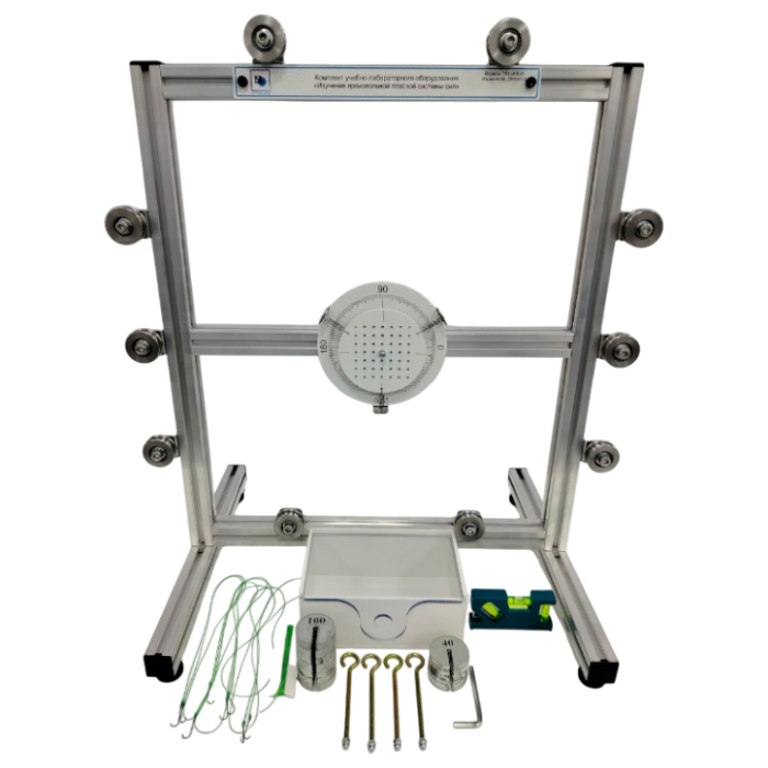 Комплект учебно-лабораторного оборудования «Изучение произвольной плоской системы сил» предназначен для проведения экспериментов по подтверждению теоремы Пуансо с использованием методов уравновешивания тела, выведенного из состояния равновесия путем приложения произвольной плоской системы сил.