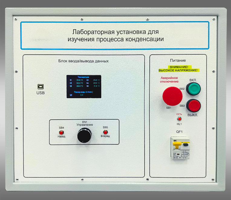 Лабораторный установка для изучения процесса конденсации предназначен для проведения лабораторных и практических работ по изучению процесса конденсации на одиночных горизонтальных трубах (гладкой и оребренной).