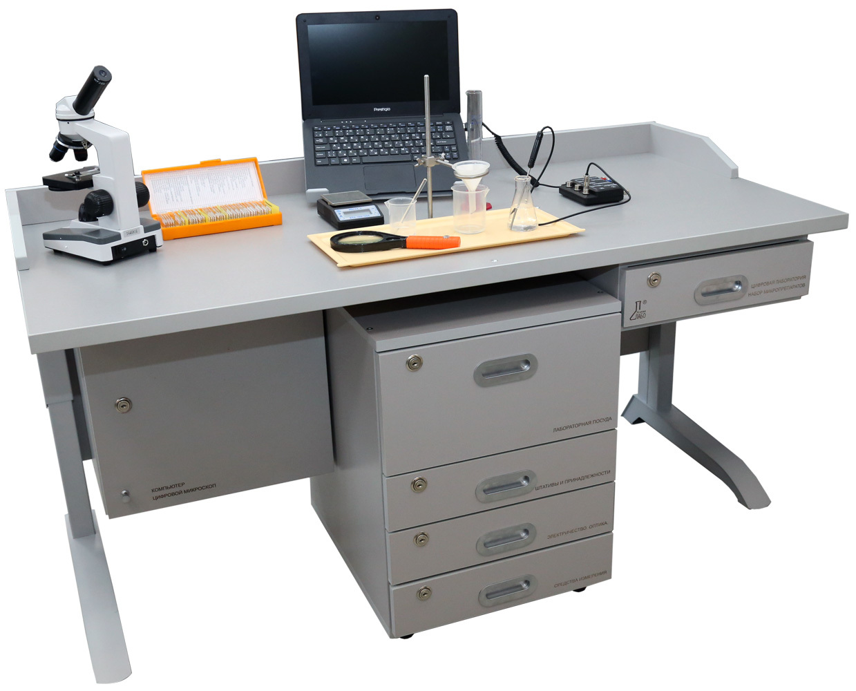 более 70 наименований современного лабораторного оборудования, в том числе: микроскоп с цифровой видеонасадкой и набором биологических микропрепаратов, цифровую лабораторию, включающую датчики для измерения температуры, температуры окружающей среды, относительной влажности, рН, освещенности, атмосферного давления.